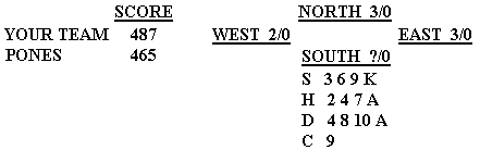 AT THIS POINT OF THIS 11 BID HAND, THE OPPONENTS HAVE ALREADY TAKEN 1 BAG, THEY HAVE PLAYED HIGH SPADES WHEN THEY DID NOT HAVE TO, AND THE ACE OF SPADES HAS NOT BEEN PLAYED YET. ON THIS TRICK, WEST LEADS THE 5 OF SPADES...YOUR PARTNER PLAYS THE 3...AND EAST IS OUT OF SPADES. IT IS OBVIOUS TO YOU THAT YOUR PARTNER HAS THE ACE OF SPADES, SO WHAT CARD SHOULD YOU PLAY?