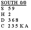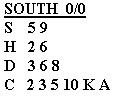 ON TRICK 2, YOUR PARD LEADS THE KING OF HEARTS....EAST PLAYS THE JACK....YOU DUMP THE 6.....AND WEST TAKES THE TRICK WITH THE ACE. THIS LEAVES YOU WITH: